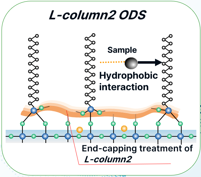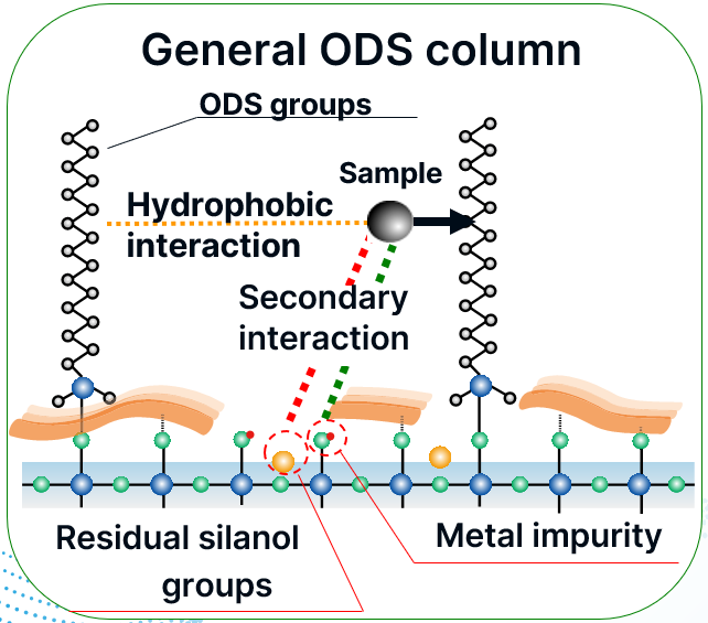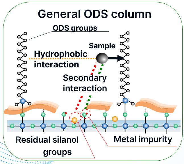 In a general ODS column, silica gel and ODS groups are bonded at one point and the silanol groups on the surface are modified and coated by end-capping treatment; however, if this end-capping is inadequate, silanol groups and metal impurities remaining on the silica surface will interact with the analytical sample and affect the peak shape.