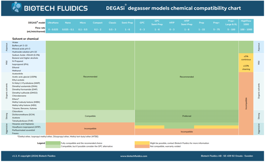 This technical document gives a detailed, yet easily accessible, graphical overview of which chemicals and solvents are compatible with the different DEGASi® stand-alone inline degasser models. This is very important information if your fluidic system is handling aggressive organic solvents. The chart can also give valuable insights for those who use mild organic solvents or aqueous solutions of chemicals.
