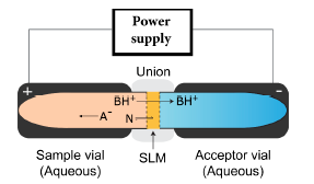 The setup uses two conductive containers (often specialized HPLC vials) separated by the membrane. The direction of the applied voltage depends on whether you’re extracting positively or negatively charged compounds.