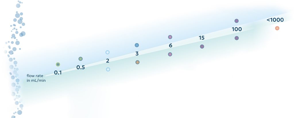 Optimised for ultra-low flow rates of aqueous and organic liquids up to 25 μL/min. Bio-compatible flow path of only 6 μL. Not for use with hexane. Available in the DEGASi® Plus and DEGASi® Integration series.
